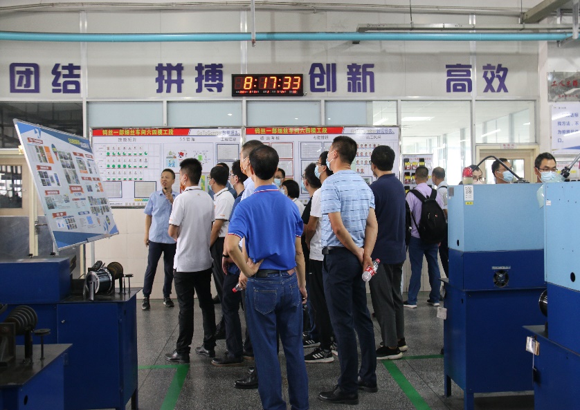 在細絲制造科科長陳江燕、電氣設計工程師王華林的帶領下,與會人員依次參觀鎢絲一部細絲車間及設備制造部生產(chǎn)車間。